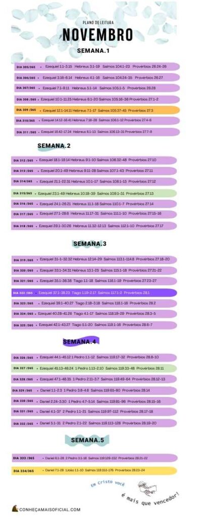 Novembro, no Plano de Leitura Bíblica 365, é um mês de fortalecimento. Passamos pelo julgamento e profecia de Ezequiel e Daniel, mas fomos consoladas com a certeza da restauração de Deus e Seu domínio sobre a história.